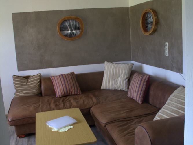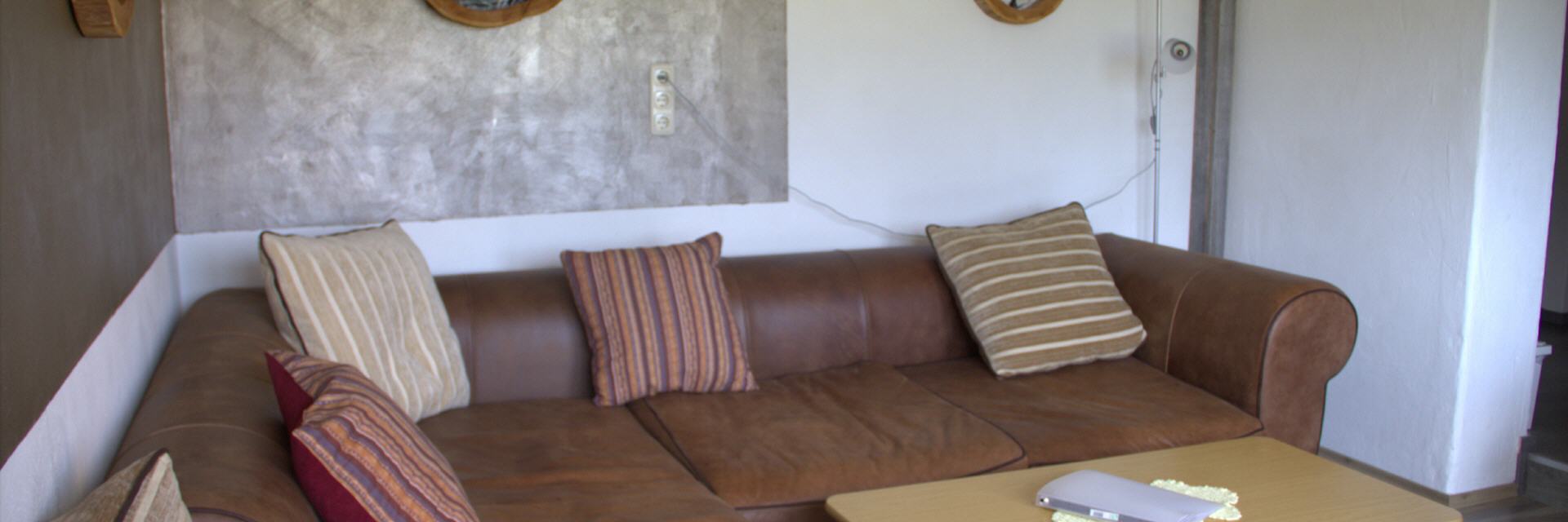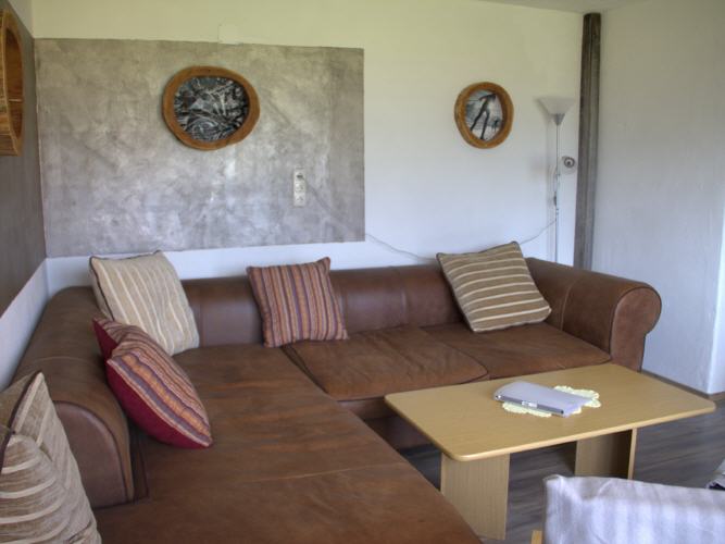 Das Wohnzimmer mit einer grossen Couch, 2 gemütlichen Sesseln, Sat TV einem Tablet und Balkon.