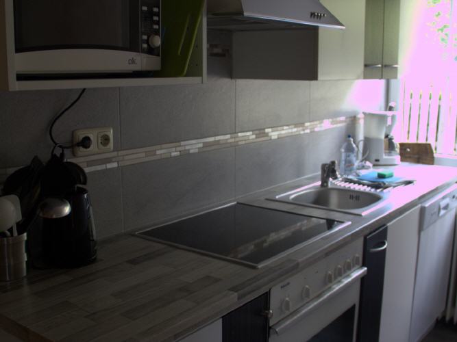 Die Küche ist ausgestattet mit einem 4 Blatten Kochfeld mit Backrohr,einer Mikrowelle, Wasserkocher, Kaffee Kapsel oder Filtermaschiene, Kühlschrank und Geschirrspühlmaschiene.