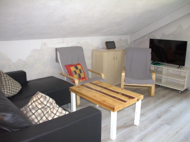 Das Wohnzimmer mit einer Couch, 2 gemütlichen Sesseln, Sat TV, einem Tablet und Balkon.