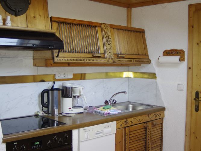 Die Küche ist ausgestattet mit einem 4 Blatten Kochfeld mit Backrohr, einer Mikrowelle, Wasserkocher, Kaffee Kapsel oder Filtermaschiene, Kühlschrank und Geschirrspühlmaschiene.