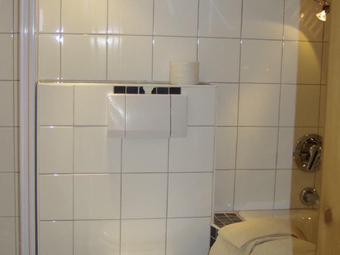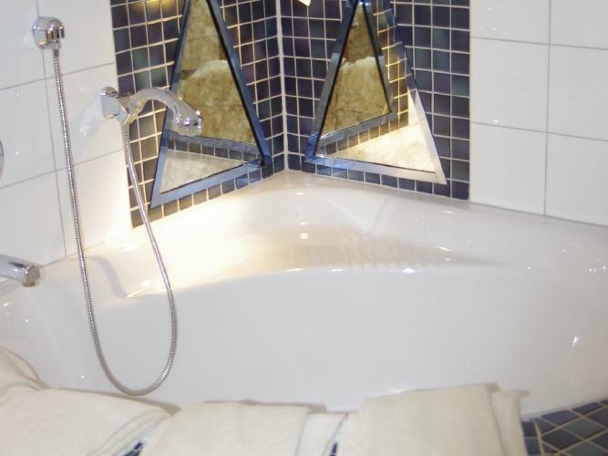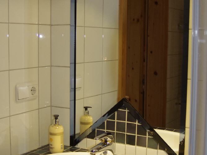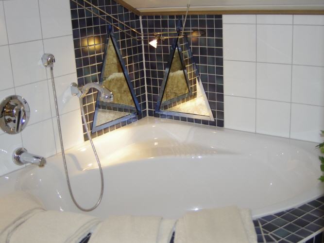 Das Badezimmer ist ausgestattet mit Dusche, Eckbadewanne, WC, Waschbecken, Kosmetikspiegel und Haarföhn.